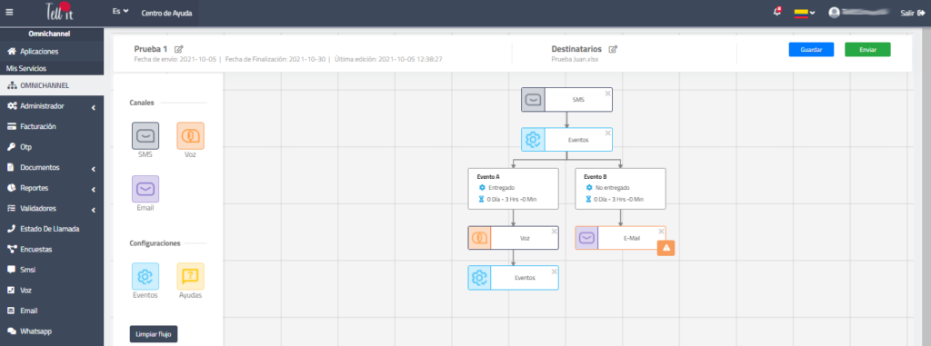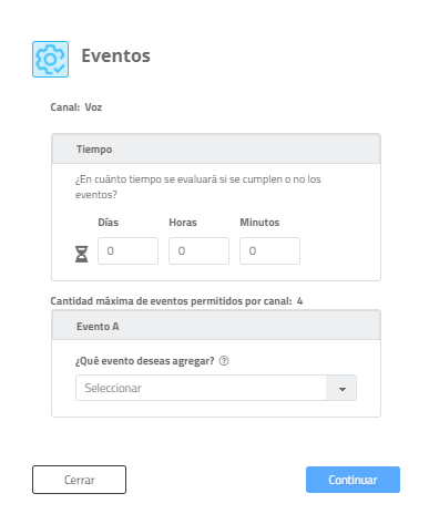 Posteriormente, se debe indicar cuáles serán los eventos que se evaluarán luego del tiempo indicado. Estos eventos varían dependiendo del canal que se haya configurado previamente (SMS, email, voz, etc).