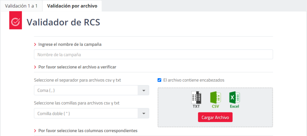 Para usar el Validador de RCS, vaya a menú Validadores > Validador de RCS. Podrá hacer validaciones rápidas o masivas.