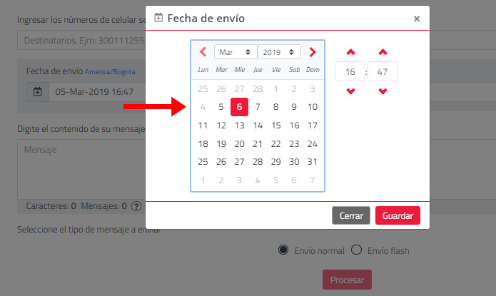 Programe la campaña rápida a través del calendario en “Fecha de Envío” seleccionando mes, día, hora y minuto de salida, si no lo modifica el envío se procesará de inmediato; de clic en guardar: