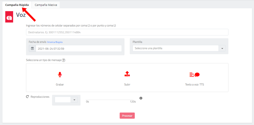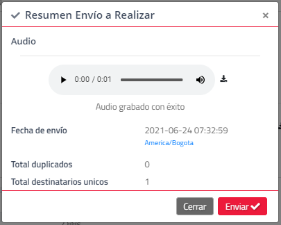 Una vez ingresados los números celulares, seleccionada la fecha de salida de la campaña, e introducido el mensaje de voz, de clic en “Procesar” y se mostrará el resumen del envío: