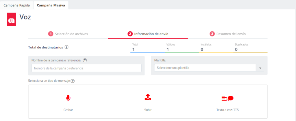 - Subir: Cargue un archivo con el mensaje de voz que desea para su campaña. Los formatos disponibles para enviar un audio son .ogg, .wav y .mp3.
