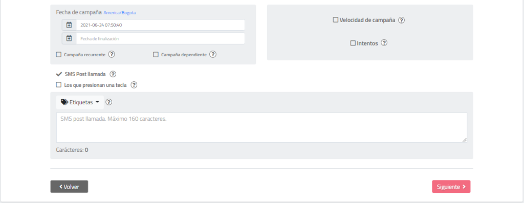 - SMS post llamada: Permite enviar un SMS luego del envío del mensaje de voz. Para esto, se puede construir el mensaje en el cuadro de texto incluyendo las variables (etiquetas) del archivo