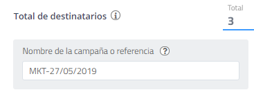 - Nombre de la Campaña o Referencia: Ponga un nombre para agrupar sus mensajes, marque su campaña con una breve descripción de la misma. Ejemplo: MKT-DDMMAAA