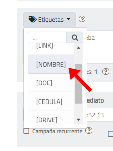 - Etiquetas (Solo en opción TTS): Contiene los encabezados de las columnas del archivo de contactos cargado en la plataforma, seleccione el encabezado para personalizar el mensaje de voz.