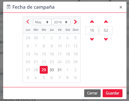 - Fecha de Campaña: Seleccione en el calendario la fecha y hora de salida de la campaña, si no se modifica, el envío es inmediato.