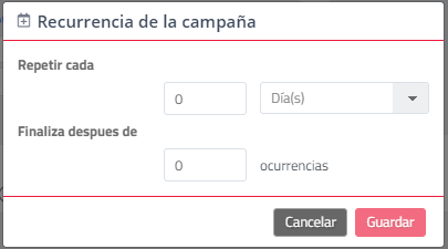 Posteriormente se desplegará una pantalla donde debe indicar la periodicidad de la repetición de la campaña y la finalización de las repeticiones. Al alcanzar dicho número de repeticiones, la recurrencia de envíos finalizará: