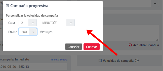 - Velocidad de la campaña (Opcional): Permite reducir la velocidad de salida de los mensajes de la campaña para controlar las acciones de sus destinatarios que puedan perjudicar sus procesos, ejemplo: invitaciones a llamar a un PBX o Call Center o invitarlos a ingresar a sitios de internet.
