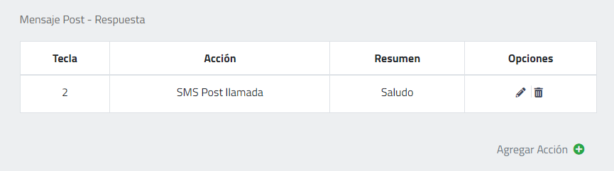 Acciones: Permite configurar acciones según la interacción del cliente. Aplica solo a las campañas de tipo Interactiva. Las acciones pueden ser Colgar/Reproducir/SMS post llamada o Plantilla. Para configurar una acción, solo hay que darle clic a la opción “Agregar acción”