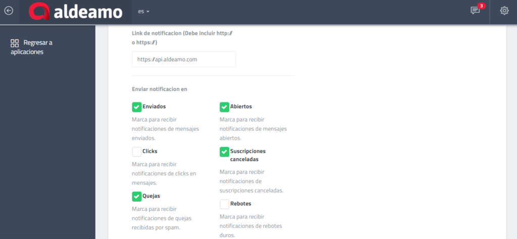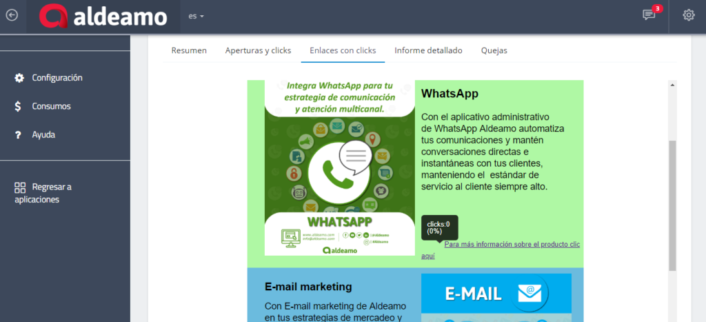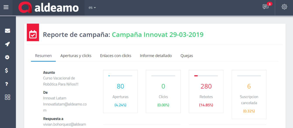 Seguido de esto, a través de la aplicación web ofrecida por Aldeamo, el usuario puede crear una campaña en la que debe establecer datos generales de la campaña y construir el cuerpo del correo mediante un constructor HTML ofrecido por Aldeamo para mejorar la experiencia del remitente y destinatario dentro del correo.