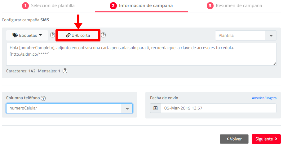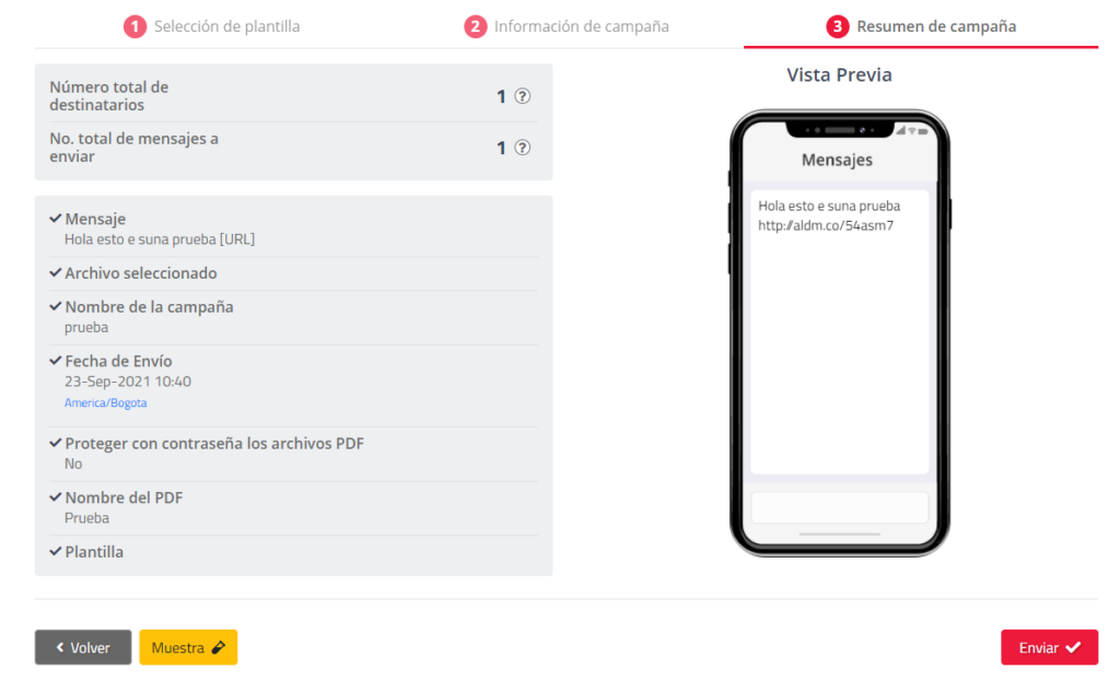 Una vez diligenciada la información de la campaña de SMS, de clic en “Siguiente” para ir a la vista previa de la campaña:
