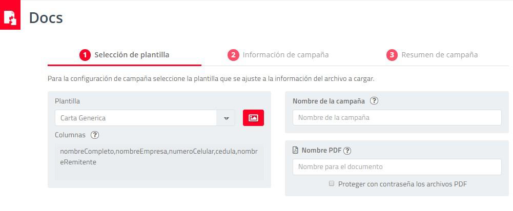 Una vez configurada la plantilla y modelo de archivo de datos (también llamado spool o caída de datos), en el menú Docs podrá realizar una campaña en la siguiente ventana seleccionando la plantilla, ingresando un Nombre de Campaña y podrá configurar el Nombre de los archivos finales. En la misma sección podrá seleccionar la opción de proteger los Docs con clave: