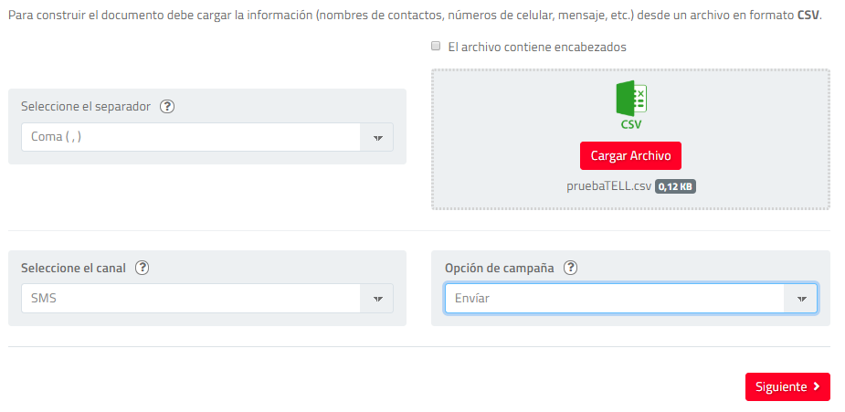En la segunda sección de la pantalla podrá realizar la carga del archivo de datos del documento, teniendo en cuenta que el formato debe ser un CSV con separadores de una lista desplegable. El archivo puede o no contener encabezados.