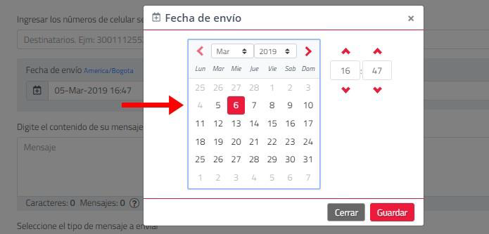 Programe la campaña rápida a través del calendario en “Fecha de Envío” seleccionando mes,día, hora y minuto de salida, si no lo modifica el envío se procesará de inmediato; de clic en guardar: