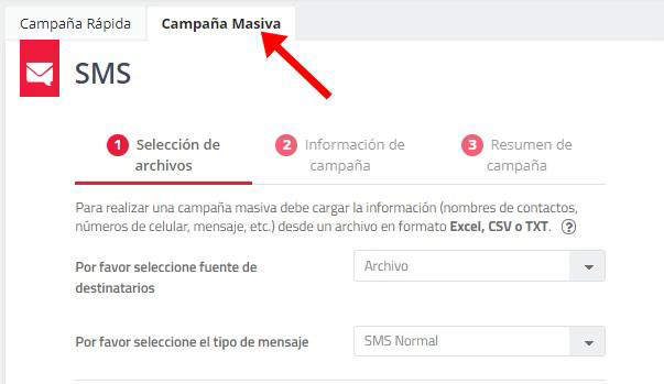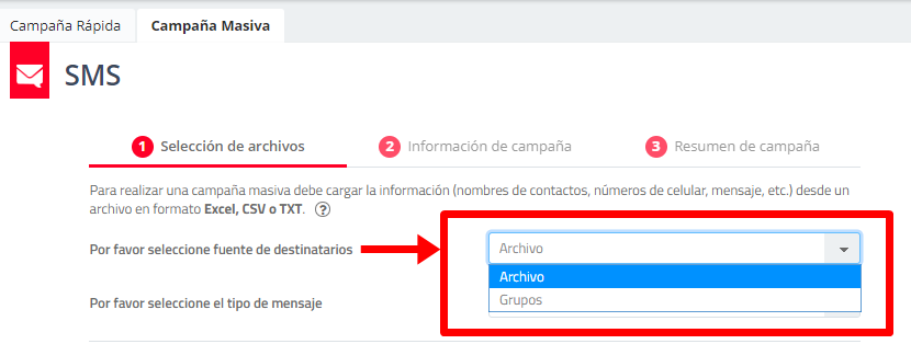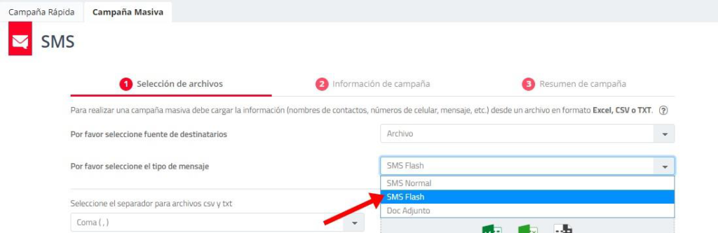 Para activar estos mensajes en campañas masivas, en el paso 1 de campañas masivas seleccione Tipo de Mensaje: SMS Flash: