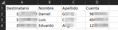 Seleccionando la opción de carga de destinatarios por archivo, es requerido construir previamente un archivo en formato Excel, csv o txt con la información necesaria para el mensaje por columnas, debe contener una columna de números celulares y puede contener columnas para personalización, a continuación, un ejemplo del archivo en Excel: