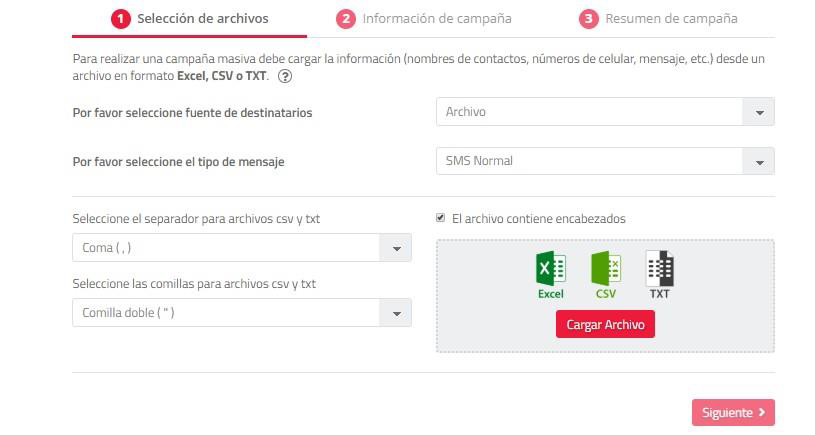 La carga de contactos puede ser por archivo en que se contenga el contacto e información para personalización de los mensajes de texto o por archivo en el que se pueden almacenar datos básicos para uso recurrente.