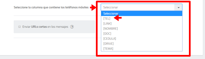 Una vez cargado el archivo, seleccione la columna que contiene los números celulares de los destinatarios y luego clic en siguiente: