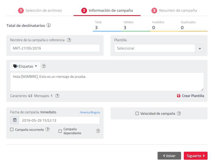 Contiene un resumen de la configuración de la campaña, rectifique y si está de acuerdo, clic en Siguiente, si requiere modificar algo, clic en Volver: