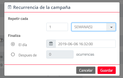 Posteriormente se desplegará una pantalla donde debe indicar la periodicidad de la repetición de la campaña y la finalización de las repeticiones, al alcanzar una fecha o un número de repeticiones: