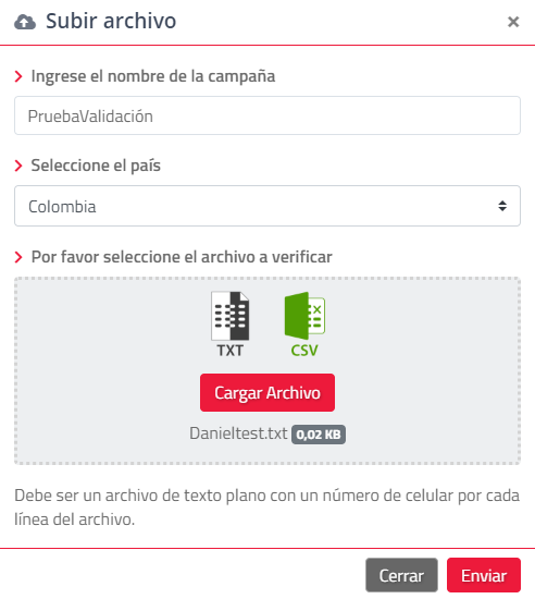 Para iniciar una validación debe hacer clic en el botón “Nuevo”, donde aparecerá una pantalla en la que debe ingresar: Nombre de la Campaña de Validación, el país1, y podrá subir el listado de números en formato TXT y CSV y finalmente clic en “Enviar”