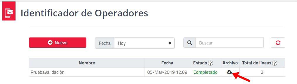 En la página de “Identificador de Operadores”, se listará las Campañas de Validación realizadas y podrá generar el exporte de las líneas y su operador correspondiente, solo debe hacer clic en la nube de descarga: