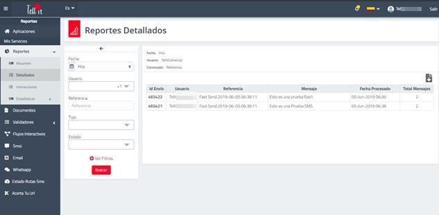 Tell it cuenta con un módulo de consulta y descarga de reportes que permite el filtrado de campañas o transacciones, haga clic en el menú Detallados y a continuación se desplegará la siguiente ventana: