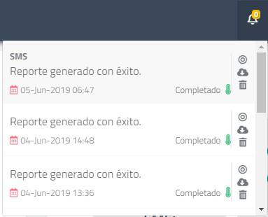 Cuenta además con la opción de descarga, solo haga clic en el ícono: y seguido de esto será notificado de la generación de su reporte en la Campana de Eventos en la parte superior derecha de la pantalla: