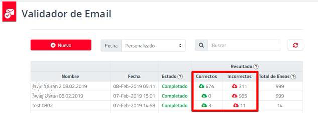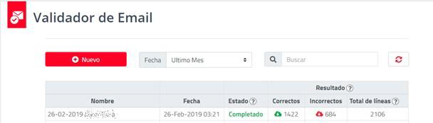 En la página de “EmailValidator”, se listará las Campañas de Validación realizadas y podrá generar el exporte de los correos válidos e inválidos, solo debe hacer clic en la nube de descarga: