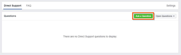 Accede a la página de asistencia directa de Facebook y haz clic en el botón verde «Haz una pregunta«.