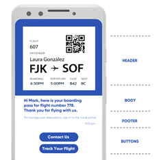 Las plantillas pueden proporcionar información adicional sobre los medios incluidos en el encabezado, y también pueden hacerse interactivas registrando botones como parte del contenido del mensaje.